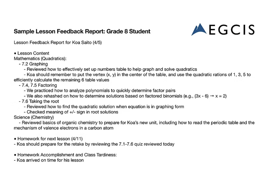 授業は週1~2回の定期スケジュールで行われ、学習習慣の定着と継続的な成長をサポートします。先生は毎週の学習フィードバックを提供し、四半期ごとの成長レポートで成果を確認できます。